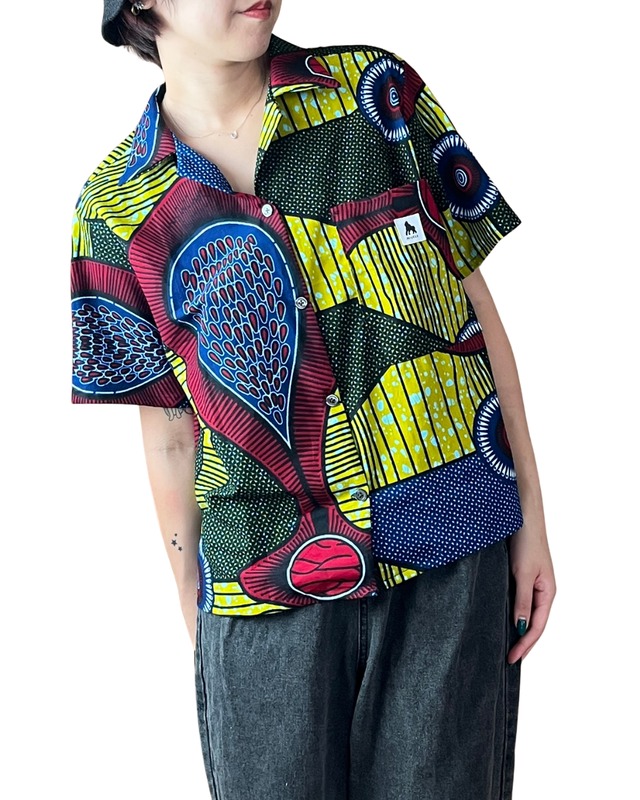 鮮やかなアフリカ布の大胆なアフロシャツ。 レディースサイズが登場しました。 ベーシックなアイテムを、オーバーサイズ×短めの丈に仕上げ、今っぽく。 しっかりめに入ったサイドのスリットが、スタイルをすっきりと見せてくれます。 ボタンを閉めても、開けても、裾を結んでも、肩にかけても可愛い万能アイテム。 幅広い体型の方に着ていただけるサイズ感に仕上げています。 布選びからデザイン、縫製まですべてを手掛けた、一点もの。 世界にたった一つのアイテムを、身に纏ってみませんか? サイズ: FREE(胸囲85〜91cm) 着丈: 約60cm 素材:綿100% モデル身長:170cm